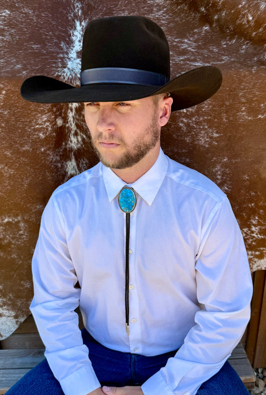 Bright Blue Kingman Turquoise Bolo Tie with dark brown leather cord and sterling silver tips