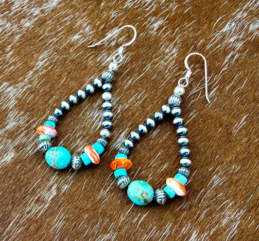 Dangle Hoop Earrings; Sterling Silver Pearls, Kingman Turquoise Beads & Spiny Oyster Beads