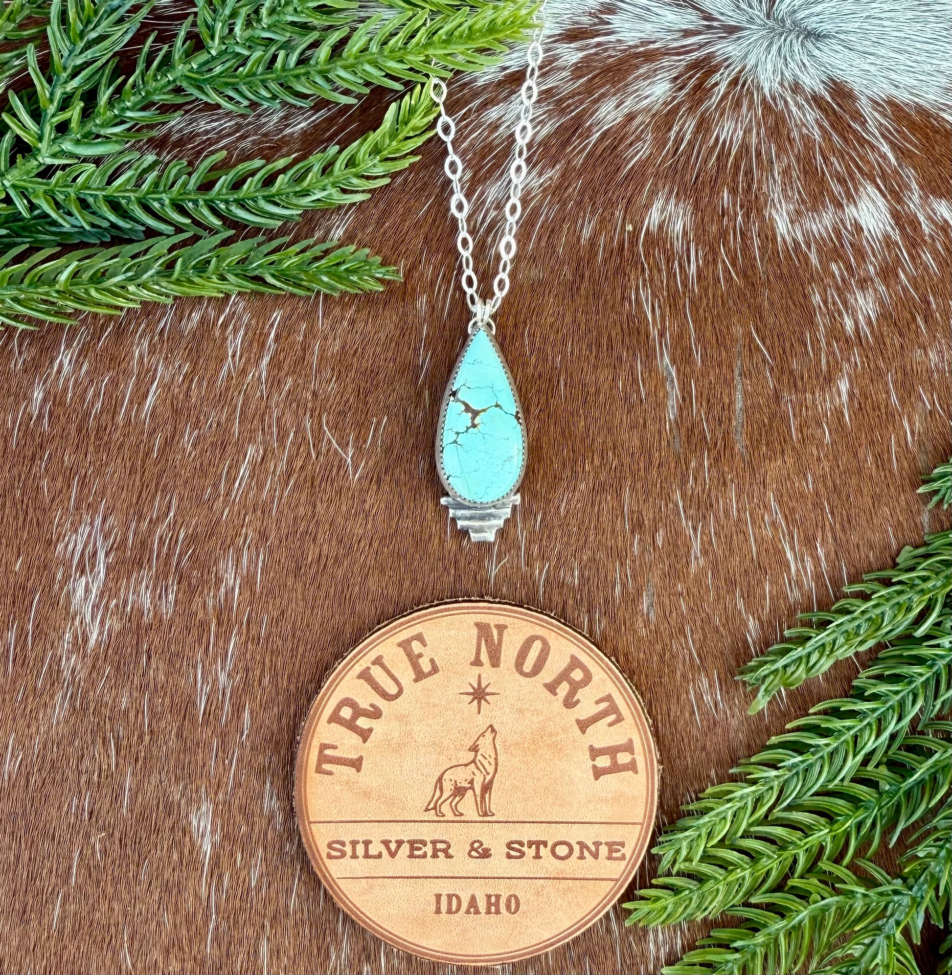 This is a teardrop shaped Blue Moon Turquoise necklace with sterling silver flare. The teardrop stone features a light green/blue color with brown matrix. It is set in fine and sterling silver. This pendant hangs on a 16” sterling silver chain with a 1” extension. The stone plus silver flare measures 5/8" x 1 1/2".
