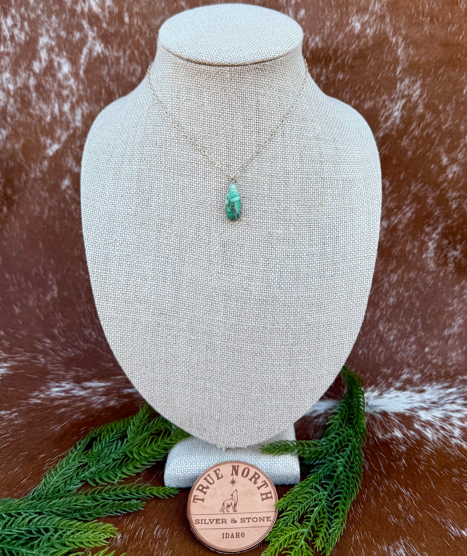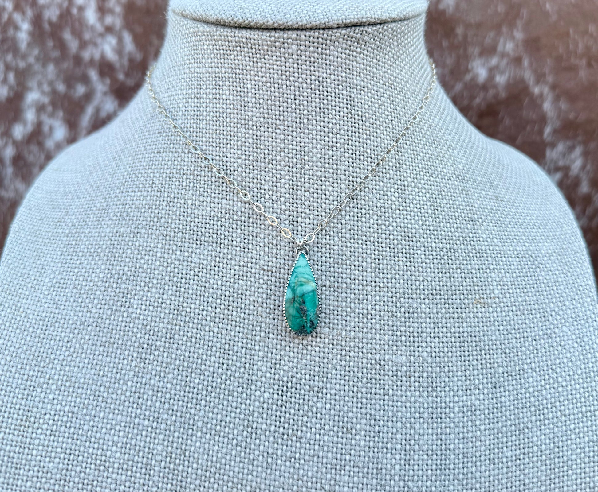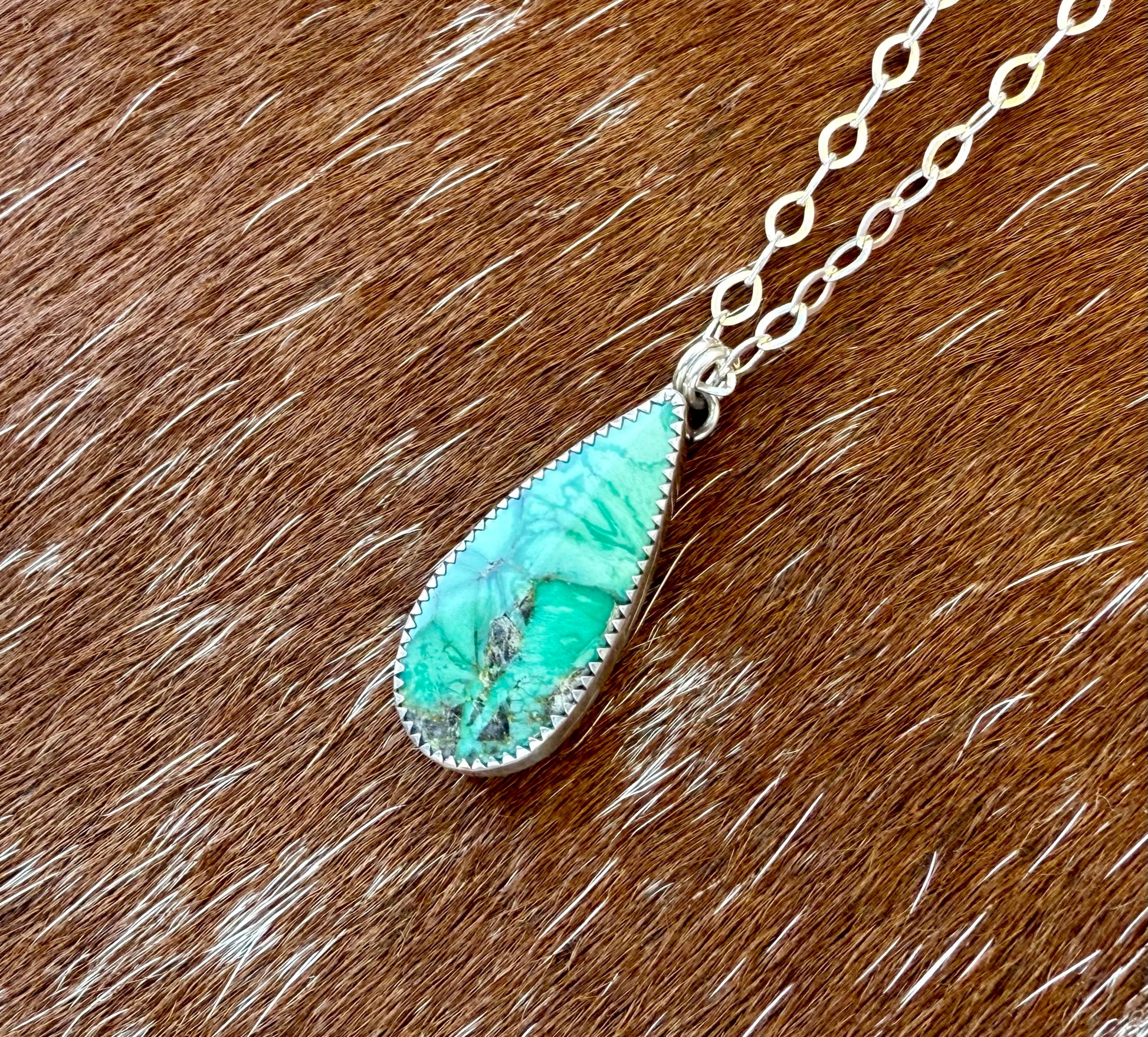 This teardrop stone is Broken Arrow Variscite. The stone is a striking blend of mint green and emerald green. It is set in sterling and fine silver. The pendant hangs on a 16" sterling silver chain with 1" extension. The stone plus setting measures 1 1/8" x 1/2".