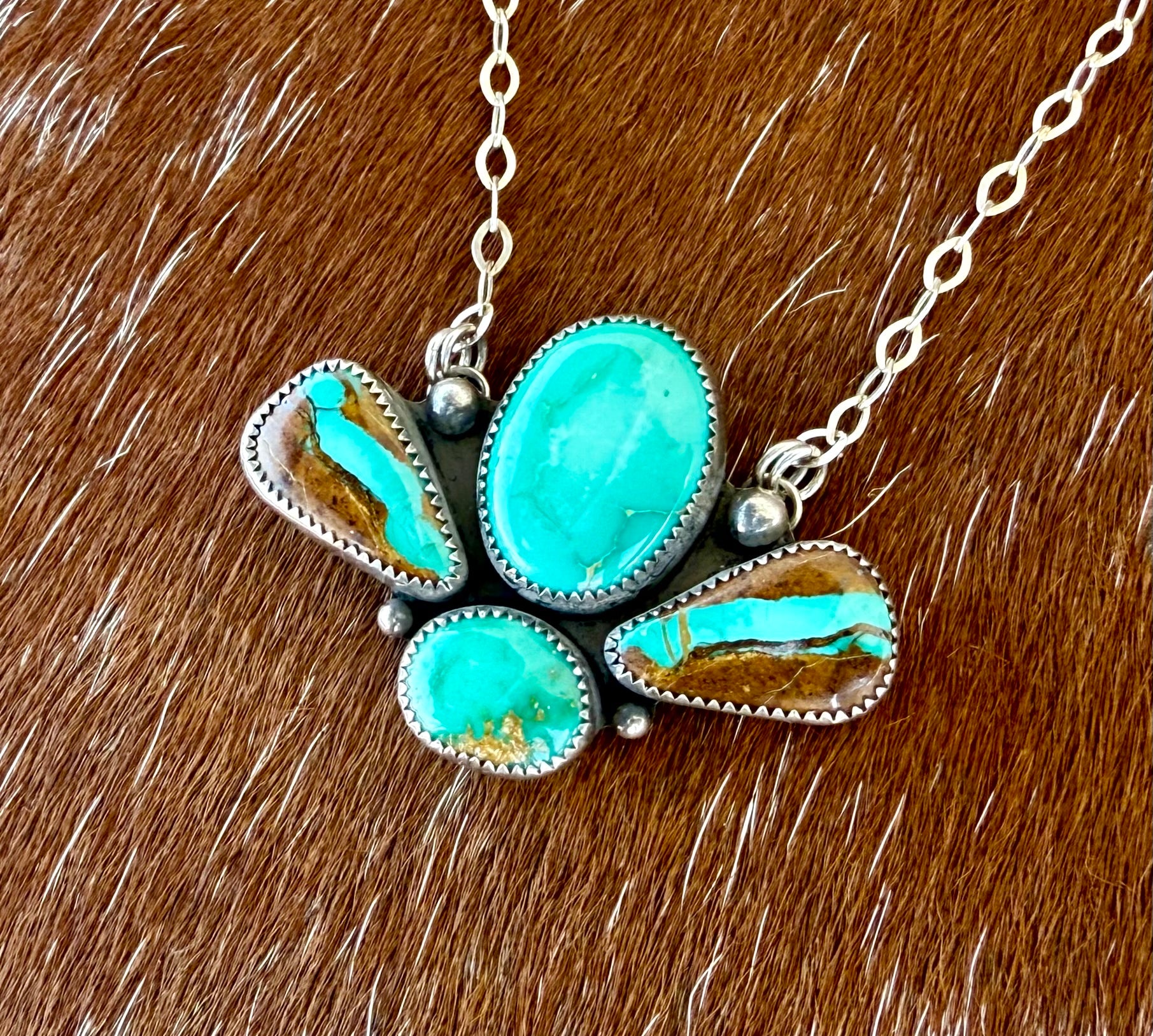 This four stone necklace features green-blue colored turquoise and golden browns. Carico lake turquoise is the larger center stone. Sonoran Gold Turquoise is the small center stone. Both side stones are Royston Ribbon Turquoise. Crafted with the utmost attention to detail, this piece is sure to make a statement. All stones are set in fine and sterling silver and hangs on a 16" sterling chain with 1" extension.