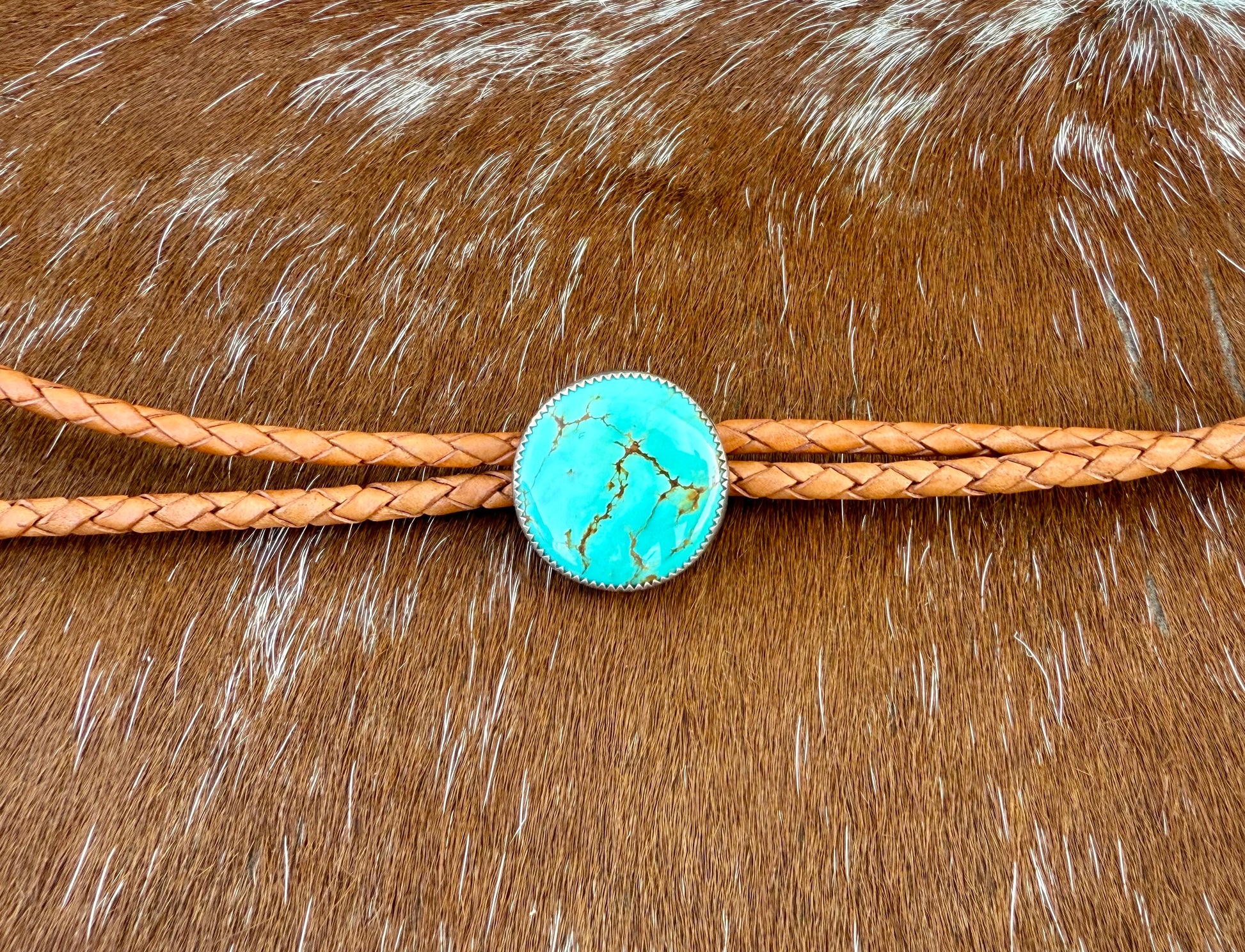 High grade Kingman Golden Web turquoise stone set in sterling and fine silver. It is on a 36” brown leather cord with handmade sterling silver tips. Hat not included. We are not responsible for a lost hat band.