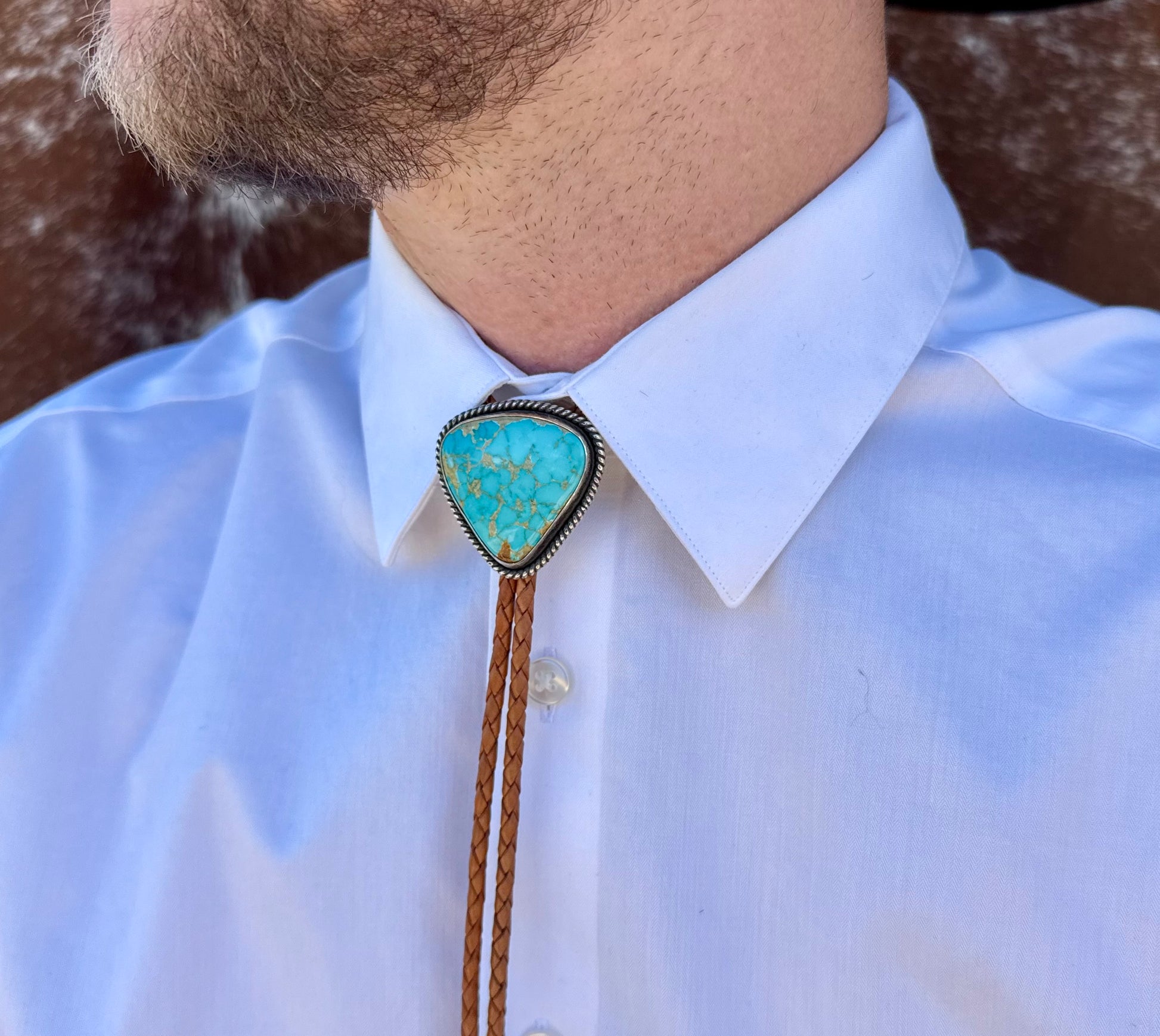 Make a statement with this Golden Web Kingman Turquoise Bolo Tie. It is set in sterling and fine silver. This bolo comes on 42" blonde leather cord with sterling silver tips.