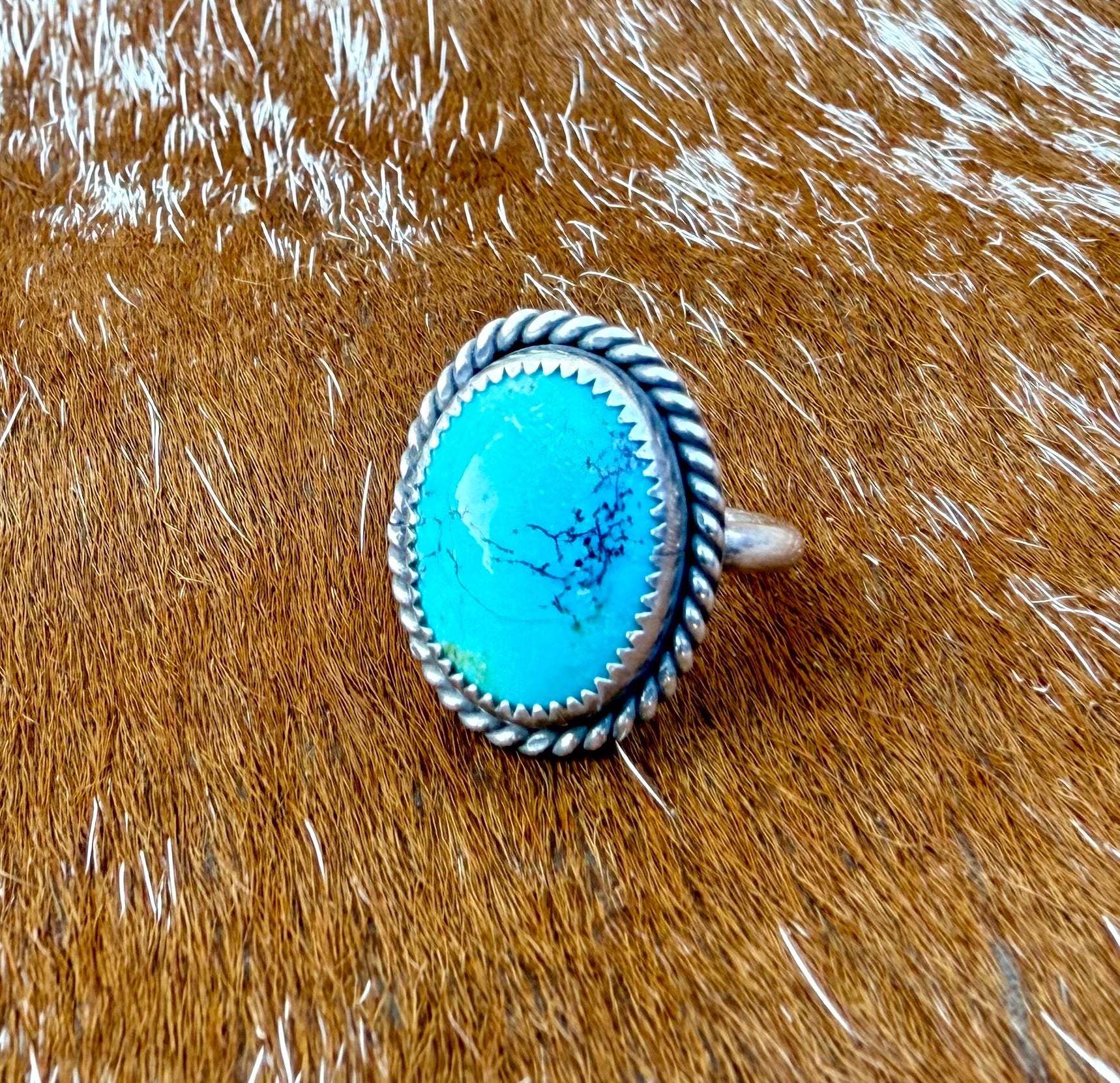 This is a Kingman Turquoise stone. It is crafted in sterling and fine silver with decorative twisted silver wire. Currently size 5 but can be made larger to 8. This ring matches our teardrop shaped Kingman Turquoise dangle earrings (sold separately). The stone plus setting is 14/16" x 11/16".