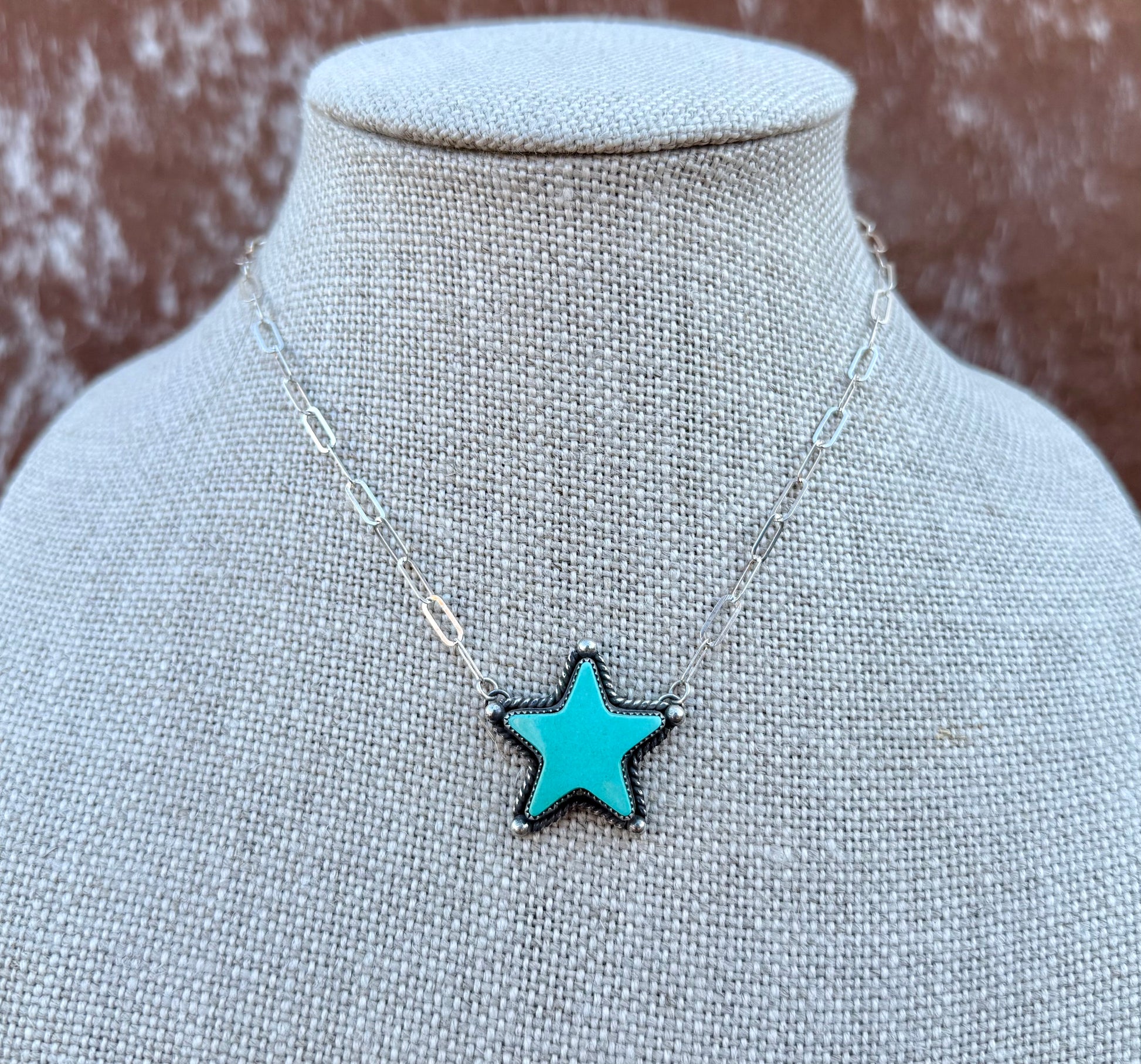 This star necklace features Chilean Turquoise. The stone is bright turquoise color. It is set in sterling and fine silver. The stone is wrapped in decorative twisted wire with silver accent balls on the star points. The pendant hangs from a 16” sterling silver paperclip chain with a one inch extension. The stone plus setting measures 1 1/4" x 1 1/8".