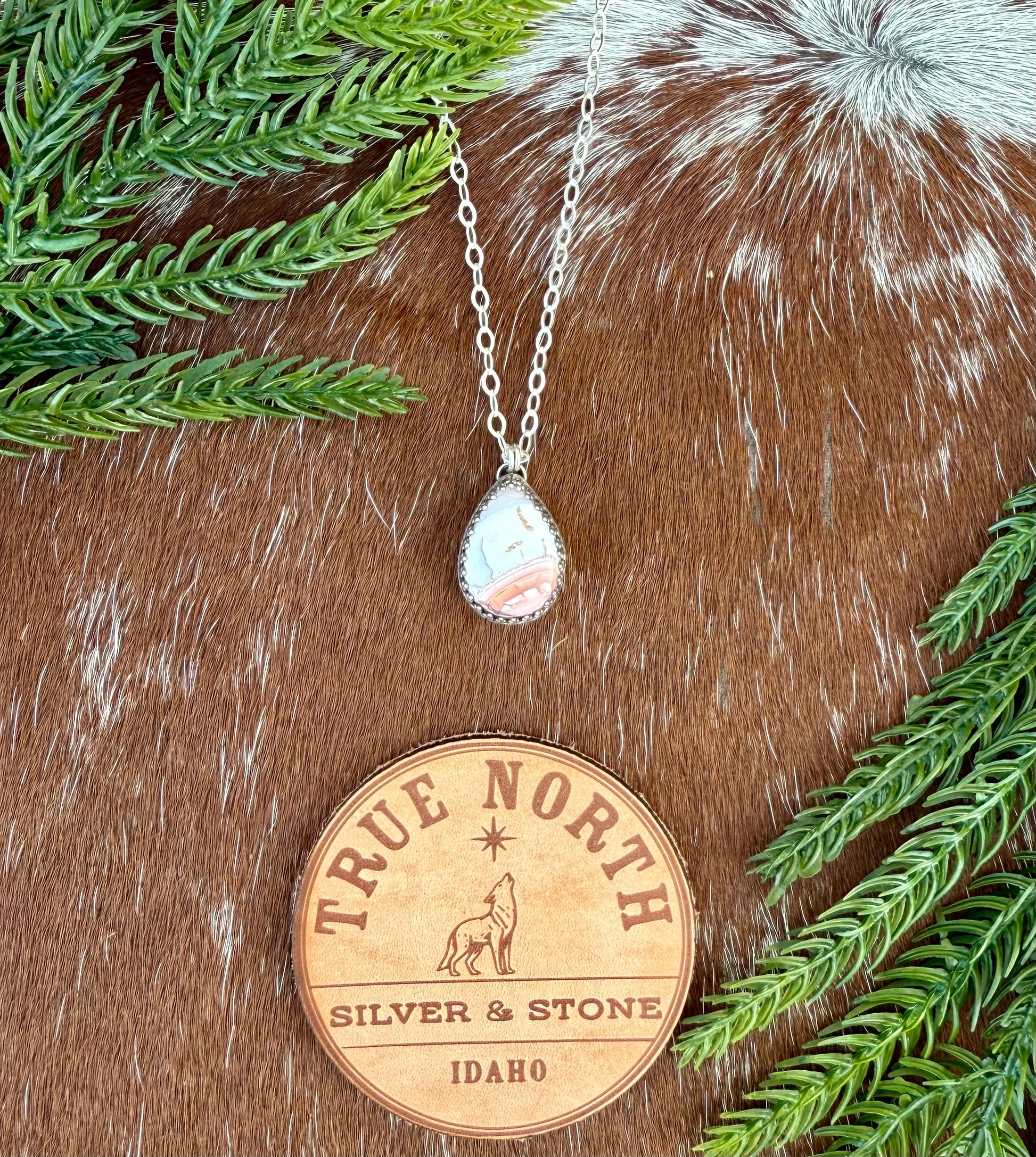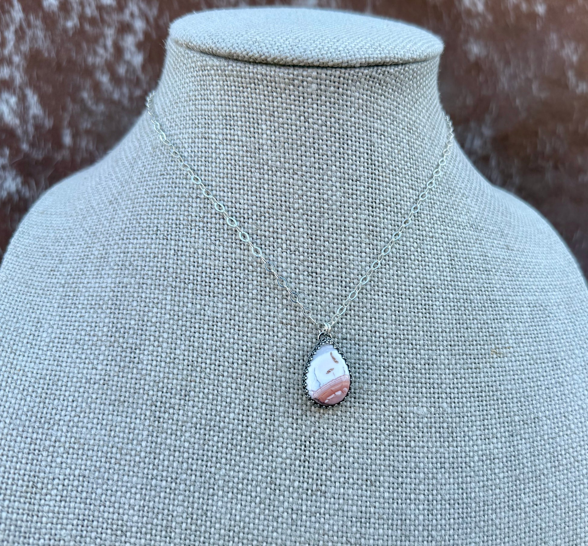 This necklace features a shimmery Mexican Fire Opal stone with decorative bezel wire. The “flash” from the opal features a shimmery white and yellow. The teardrop stone is set in fine and sterling silver. The pendant hangs on a 16” sterling silver chain with a 1” extension. The stone plus setting measures 5/8" x 7/8".