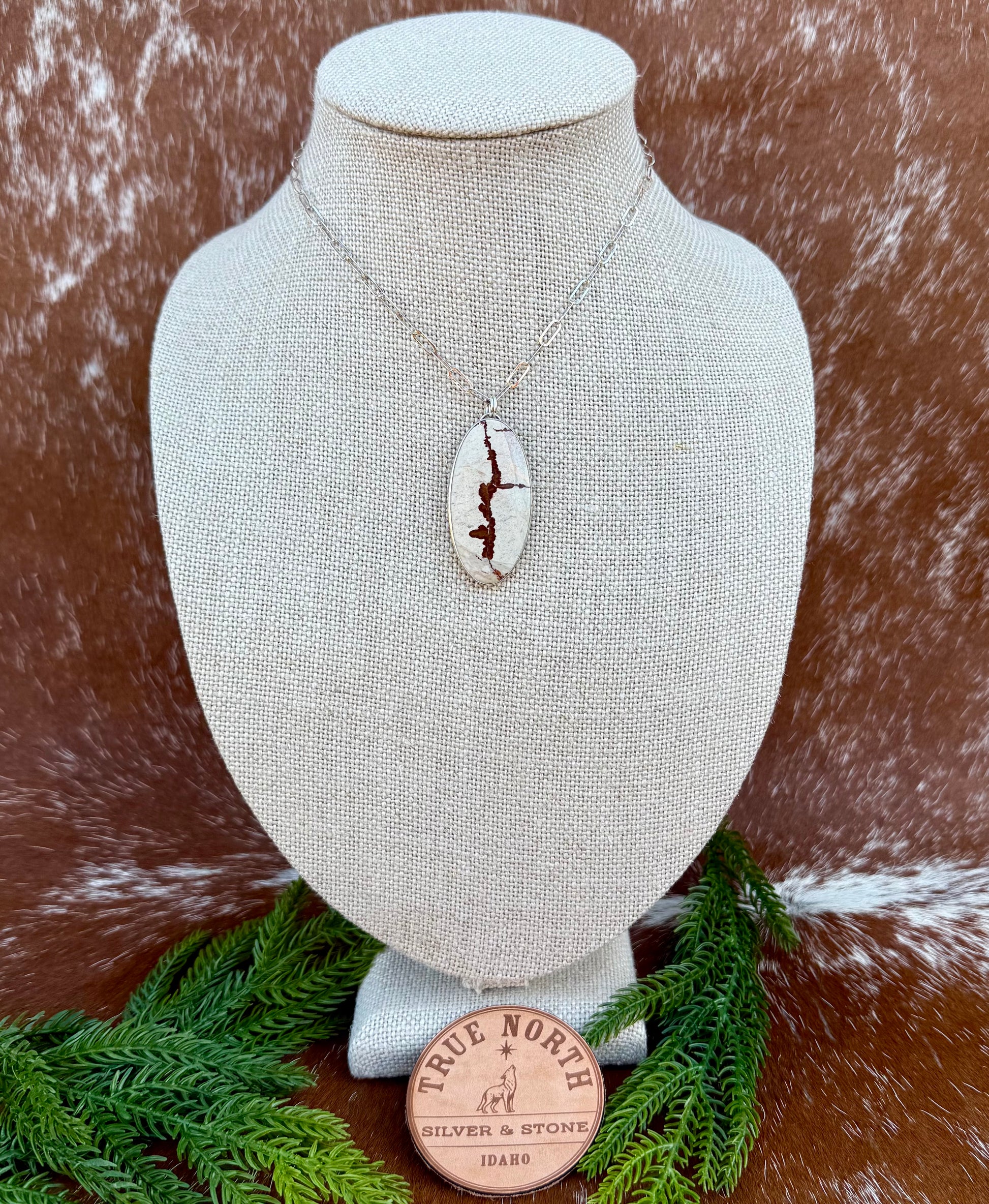 This stunning stone is Moonshine Jasper. It was minded from the Owyhee Mountains on the Oregon side. The stone is a cream color with dark brown and light brown matrix. It is set in sterling and fine silver. It hangs on a sterling silver 16" paperclip chain with a 1" extension. The stone plus setting measures 1 1/16" x 2 1/16".