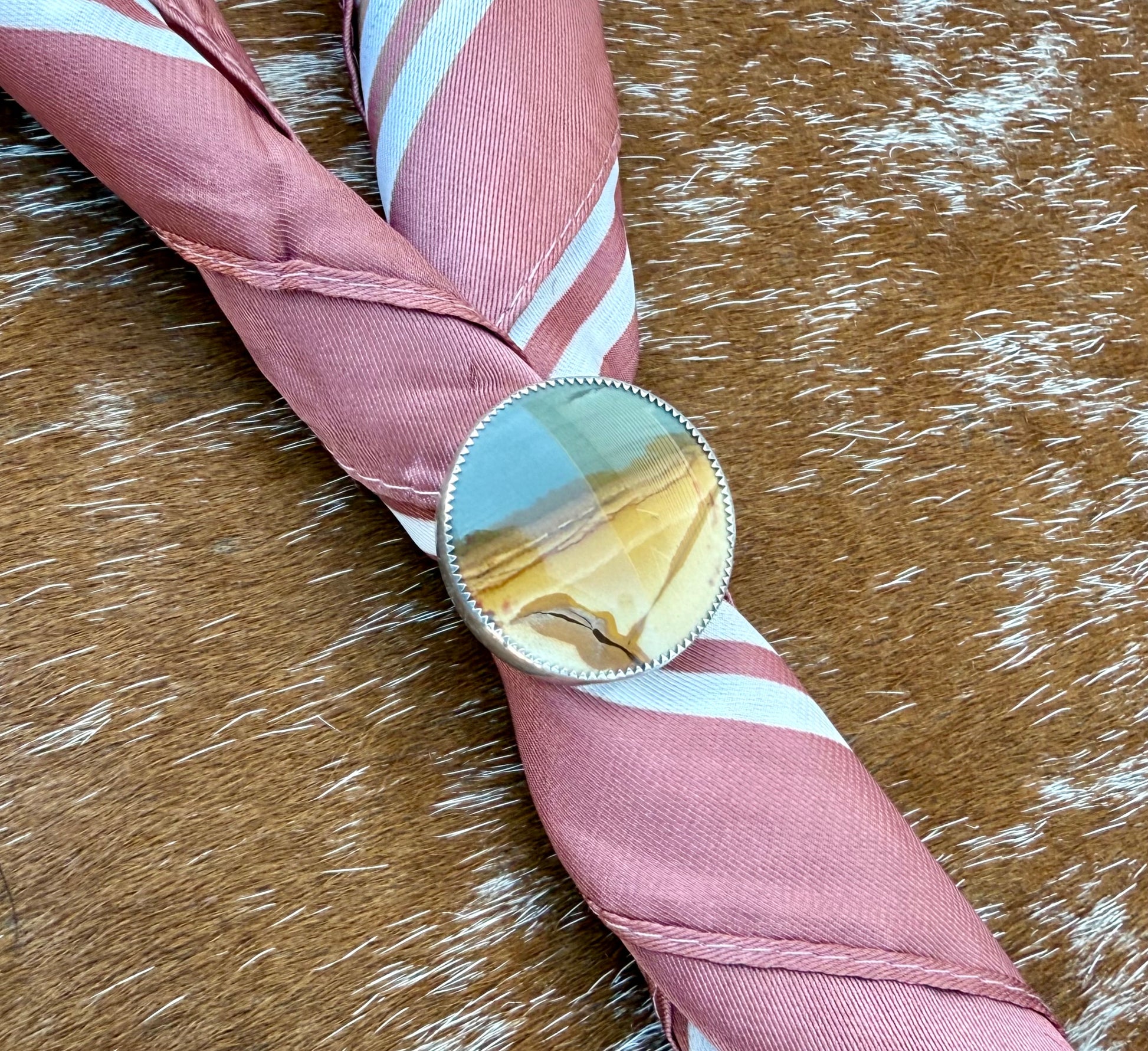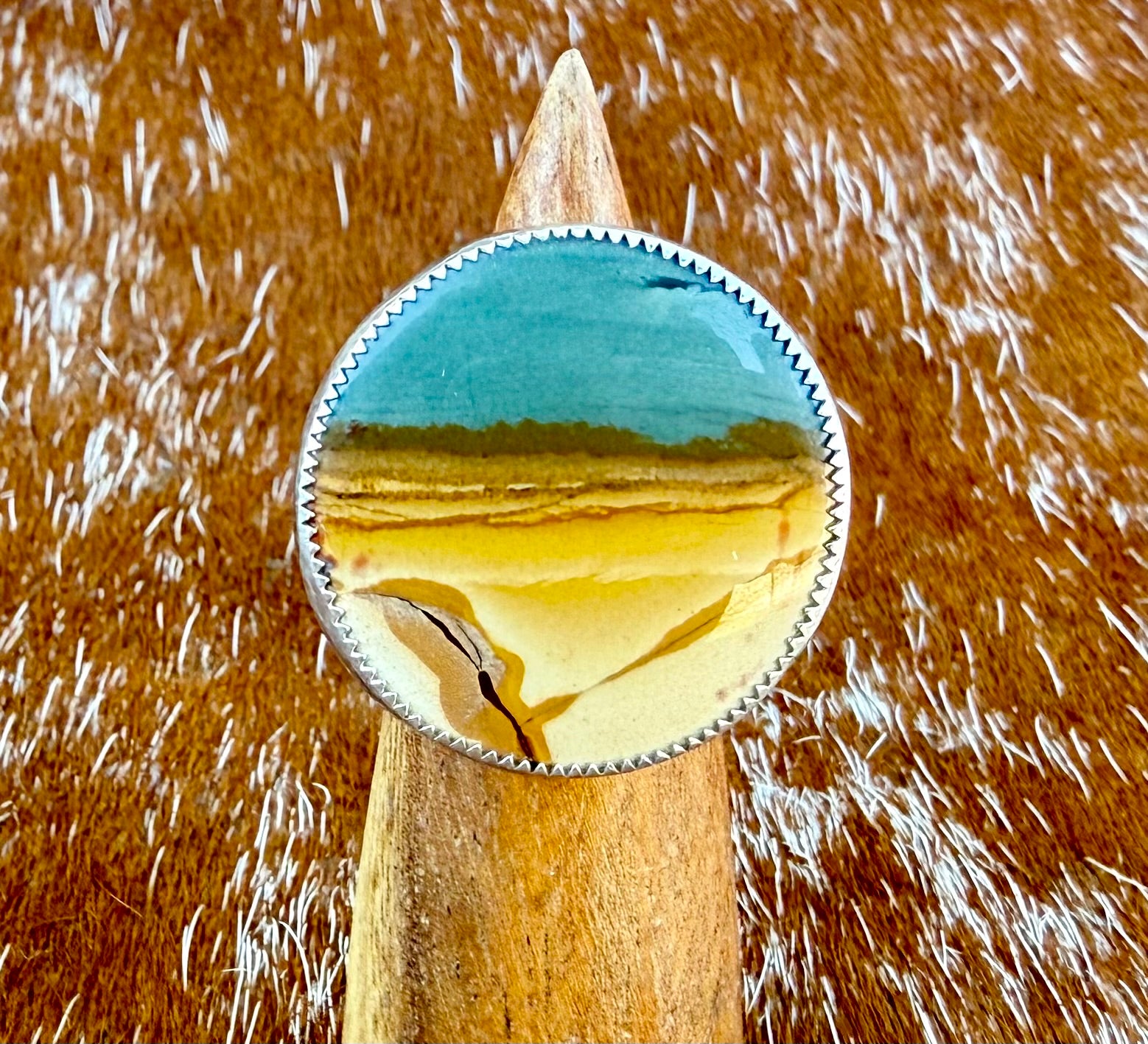Mined from the rugged Owyhee Mountains, this one-of-a-kind Picture Jasper ring honors a stone shaped by time and the steady hand of nature. This stone reflects a serene landscape of muted tans, grounded browns, and tranquil blues. Currently size 7.5 but can be made larger to 9. The stone plus setting is 1 1/4" x 1 3/16".