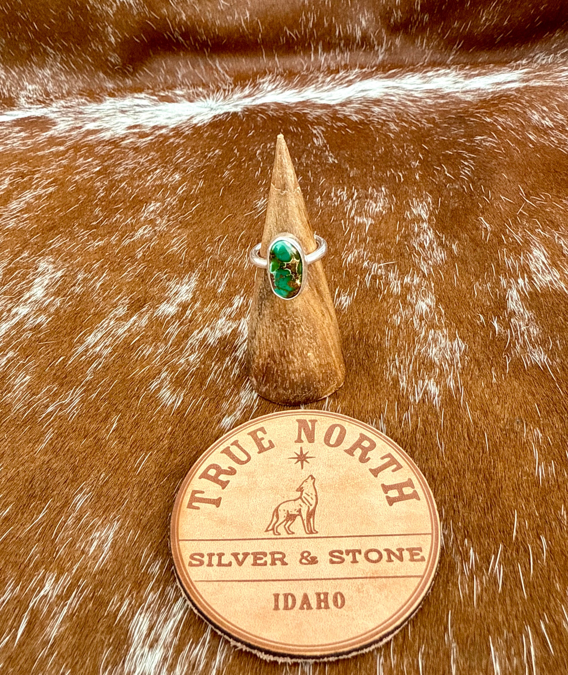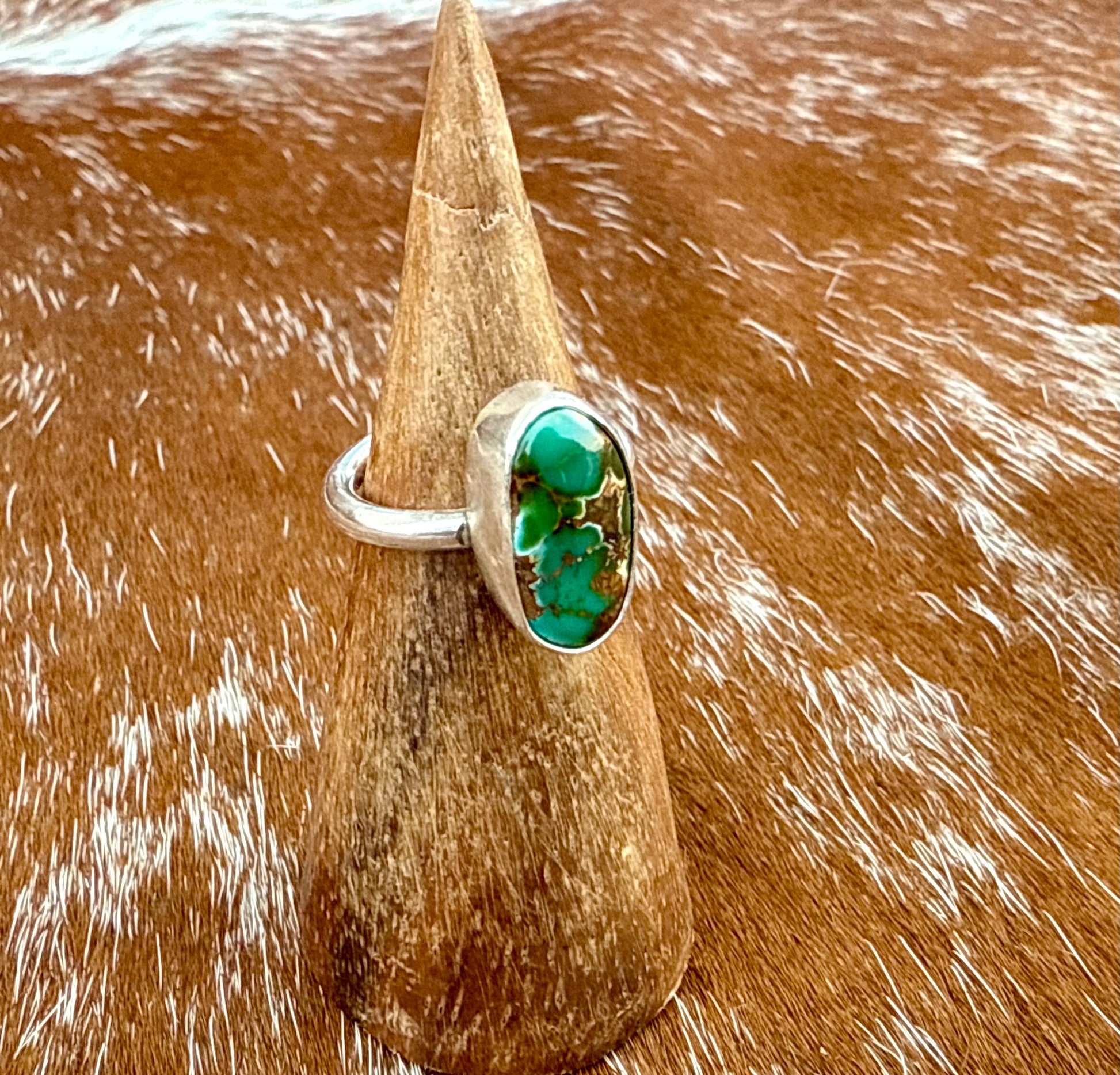This petite ring features Sonoran Gold Turquoise. The stone has light and dark green hues with brown matrix. It is set in fine and sterling silver. Current ring size is 5.25 but can be made larger to 7.25.