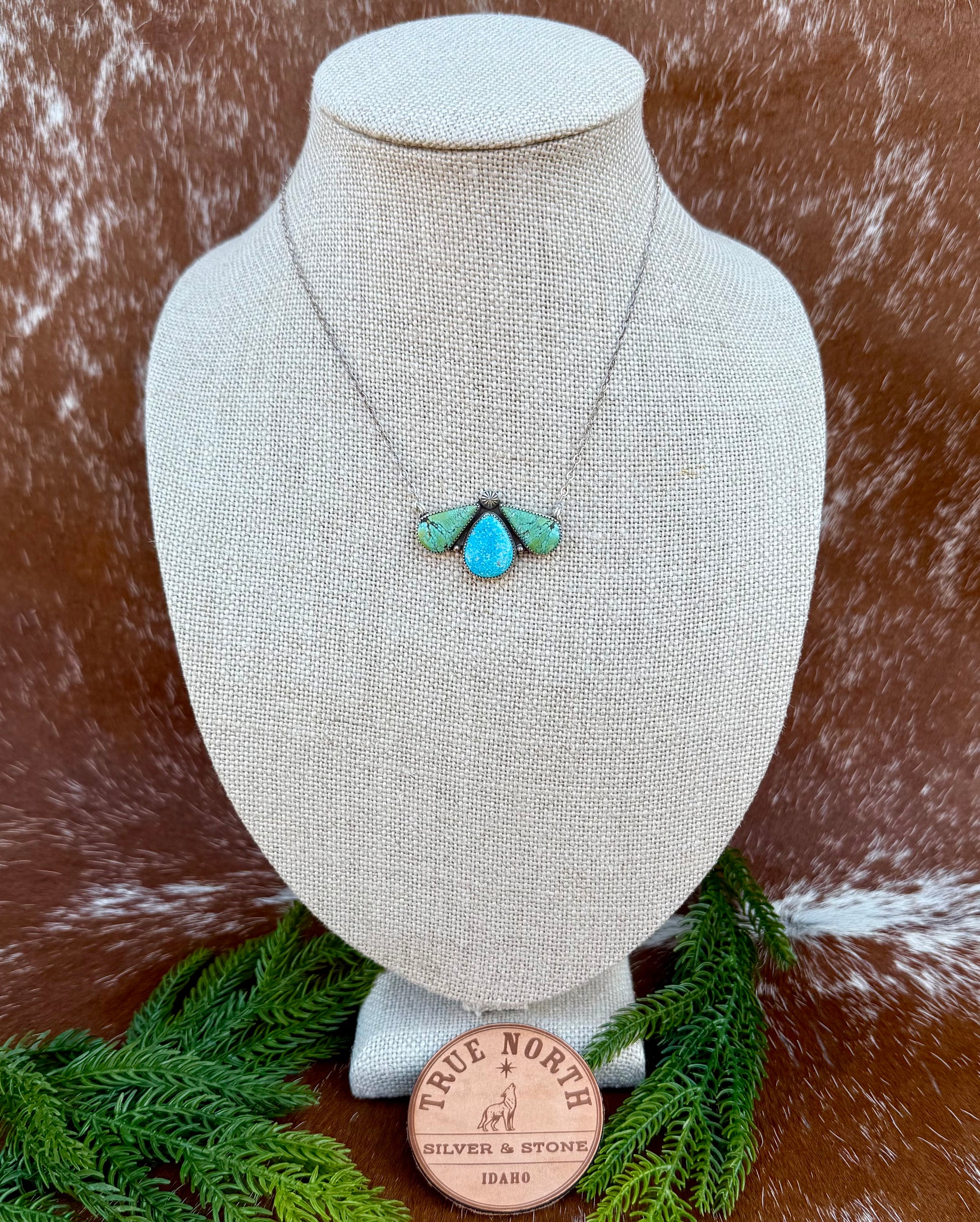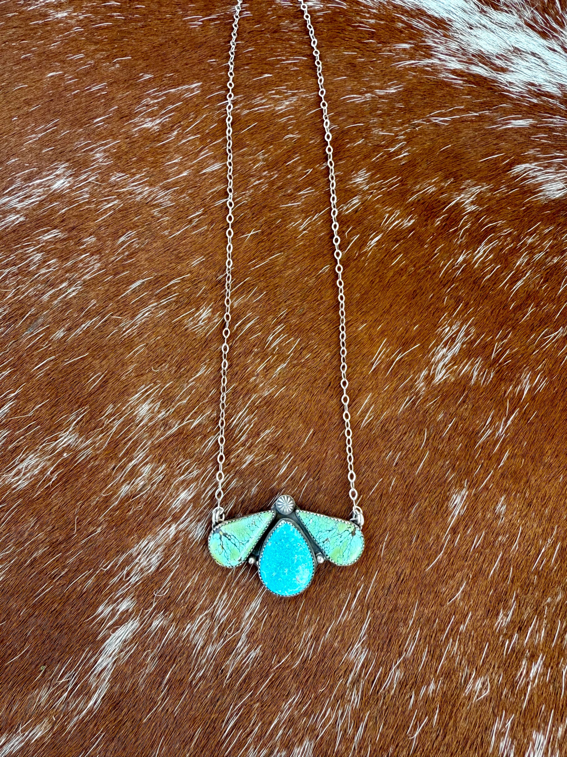 This triple stone necklace features Blue Moon Turquoise and Sonoran Blue Turquoise. The center stone is the Sonoran Blue Turquoise. It has a bright baby blue hue with delicate white matrix. The two side teardrop stones are Blue Moon Turquoise. Both stones are a light green with blue hues and delicate brown matrix. The bright blue from the center stone brings out the blue undertones from the two teardrop stones.