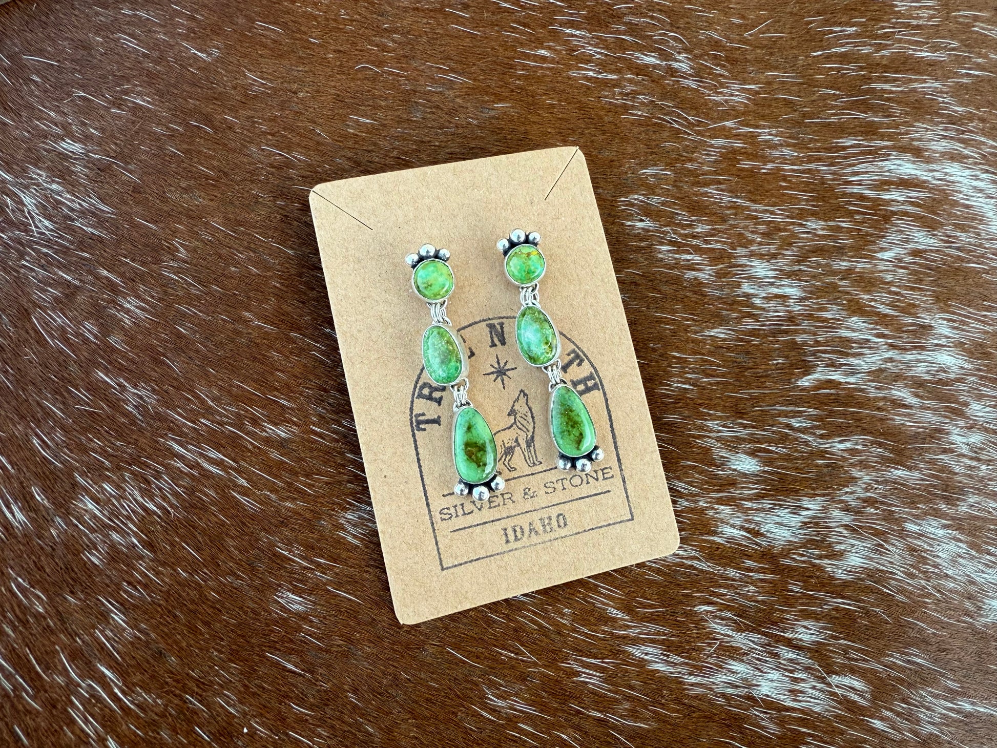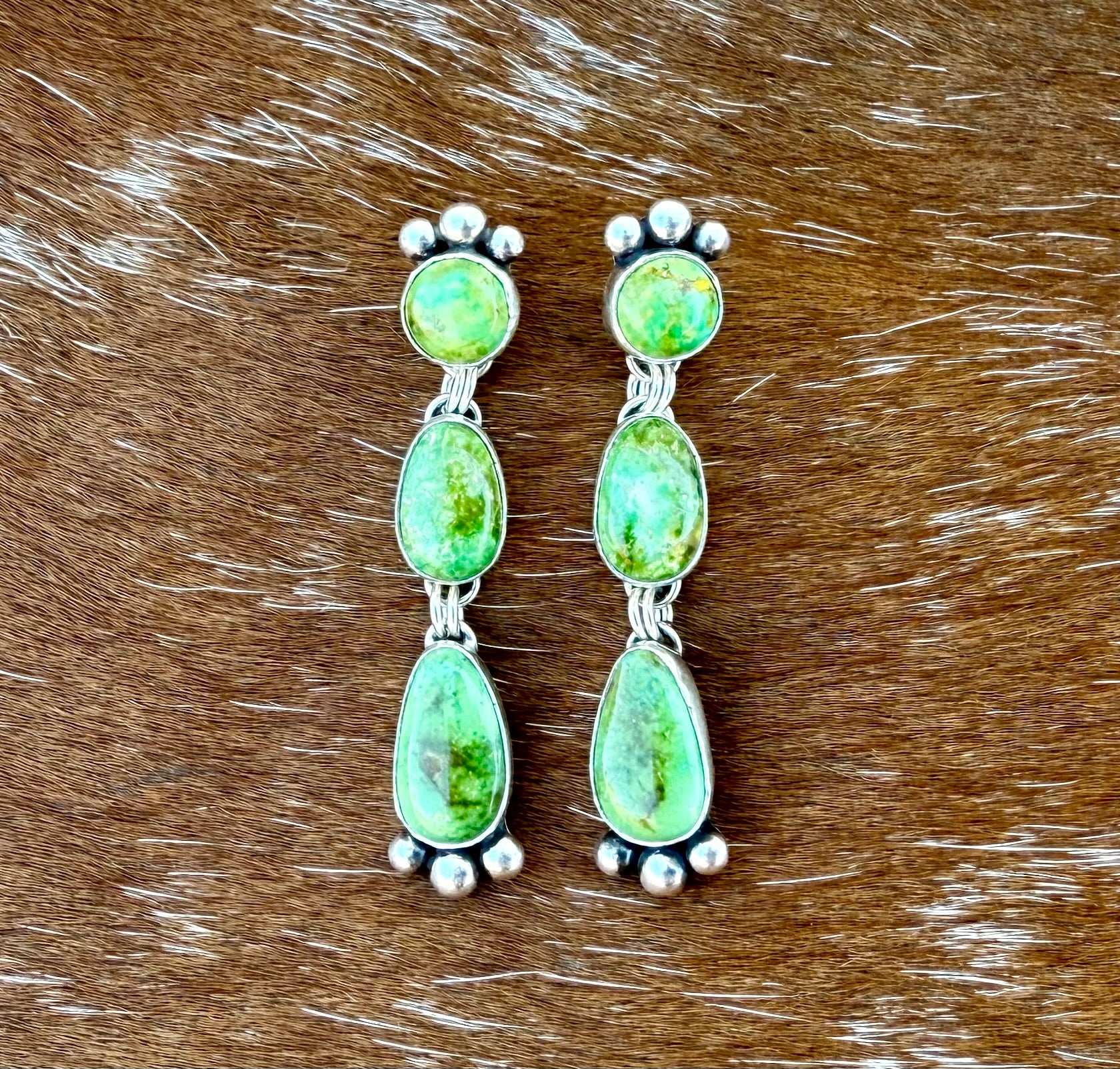 These triple stone stud dangle earrings feature Sonoran Gold Turquoise. This turquoise is mined from Sonora, Mexico. The stones are mix of bright green hues. Each stone is crafted in fine and sterling silver. There are decorative silver ball accents on the top setting and bottom setting. Each earring roughly measures to 3" x 7/16".