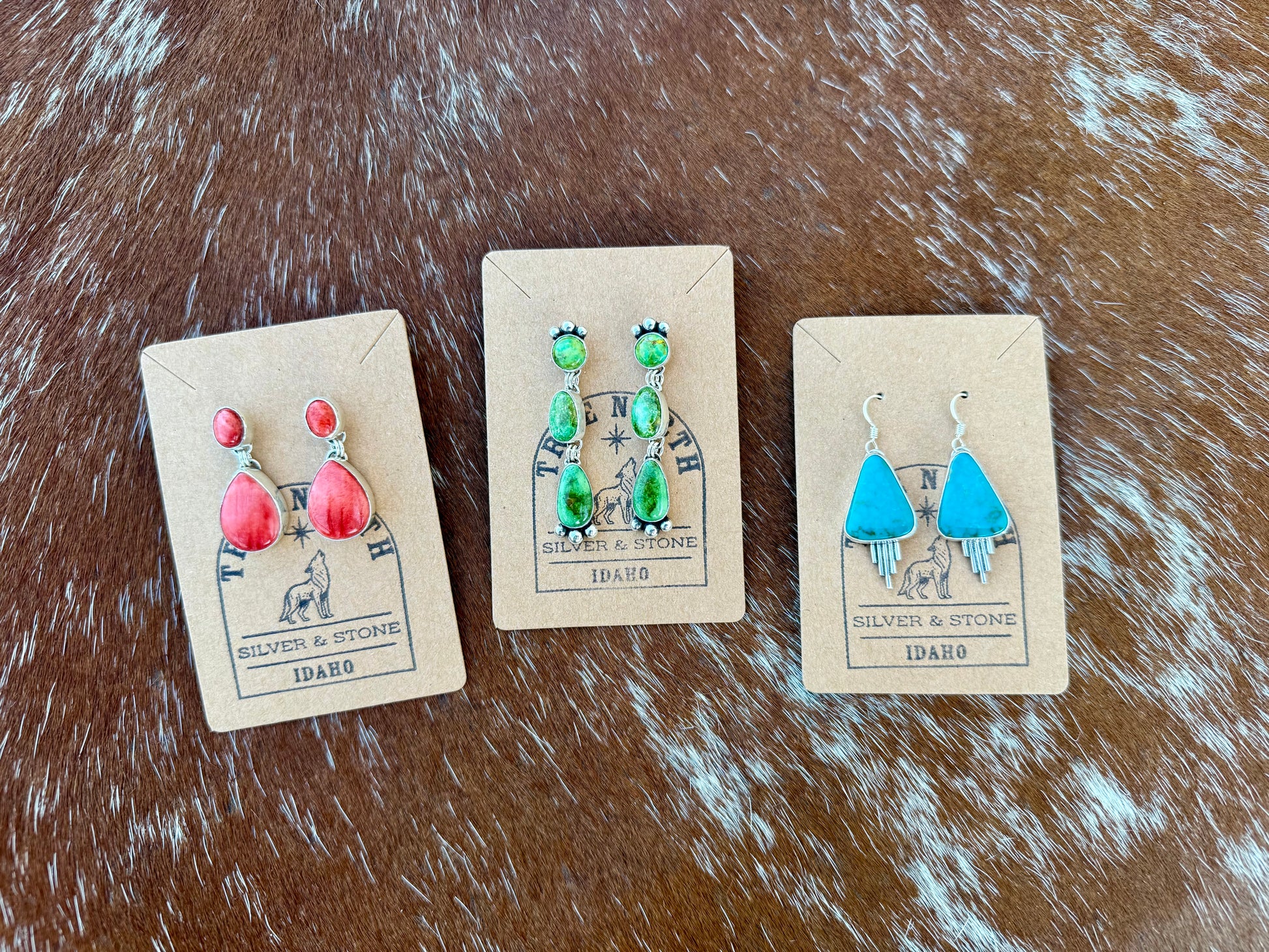 Each piece of jewelry is handmade by us. We strive to hand pick each stone for its beauty or interest. The stones are all high quality genuine turquoise or gemstones bought directly from the miners. We adorn each stone with a simple setting to accentuate the beauty of each stone. Every stone is different and therefore every piece is one of a kind.