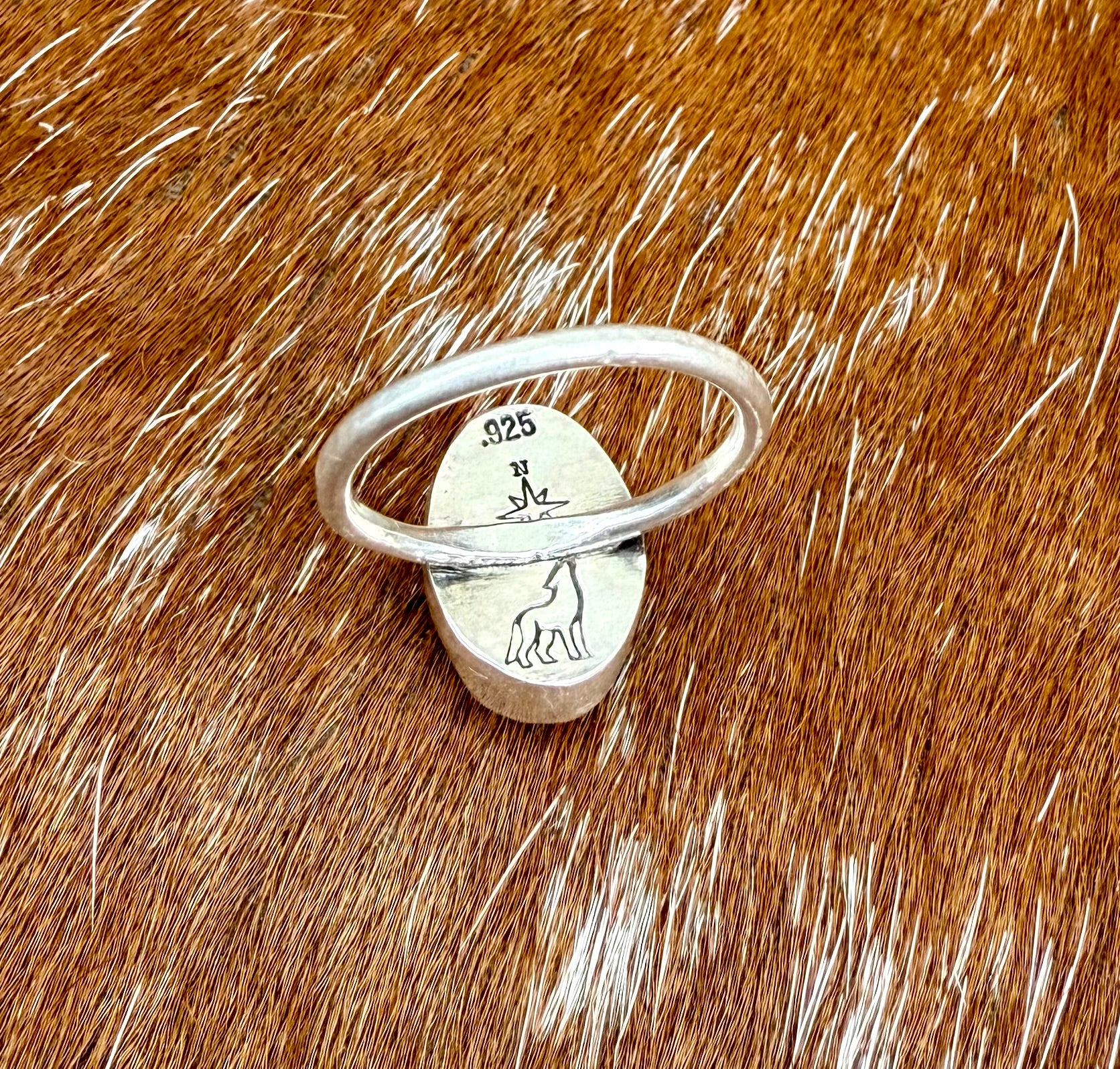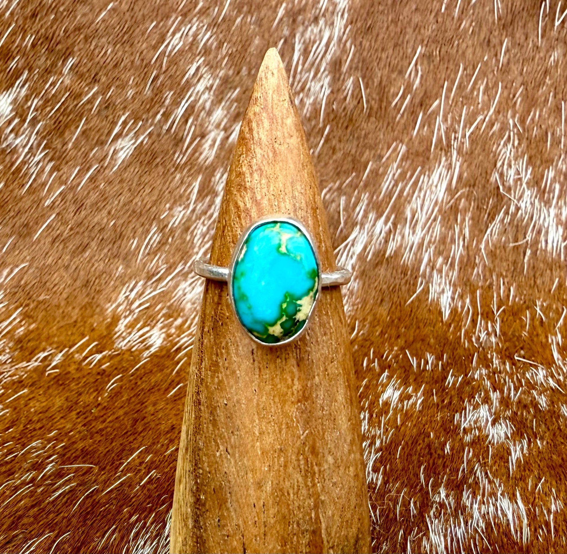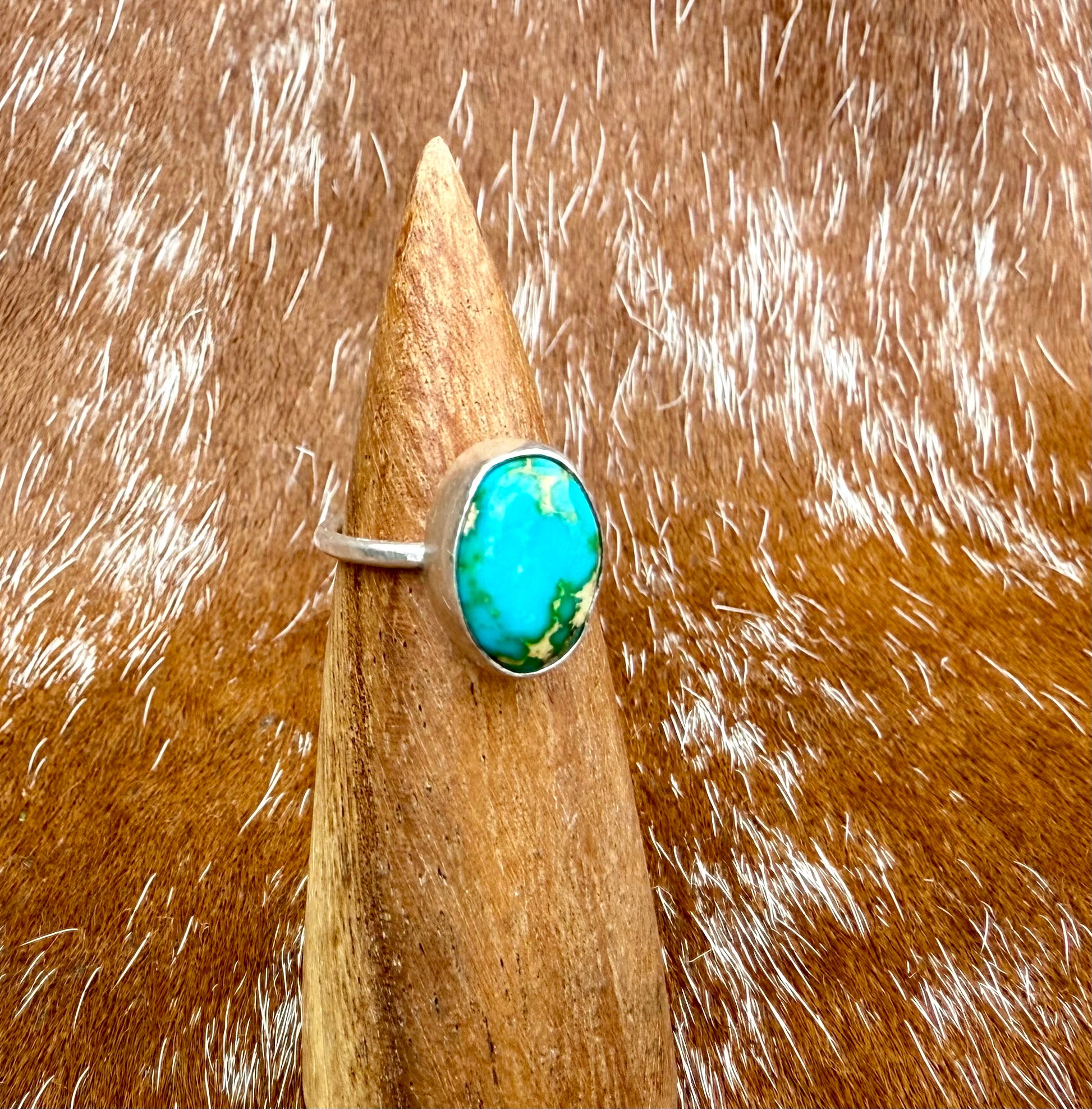This petite ring features Sonoran Gold Turquoise. The stone has a bright pop of blue with light green hues and beige matrix. It is set in fine and sterling silver. Current ring size is 5.5 but can be made larger to 6.