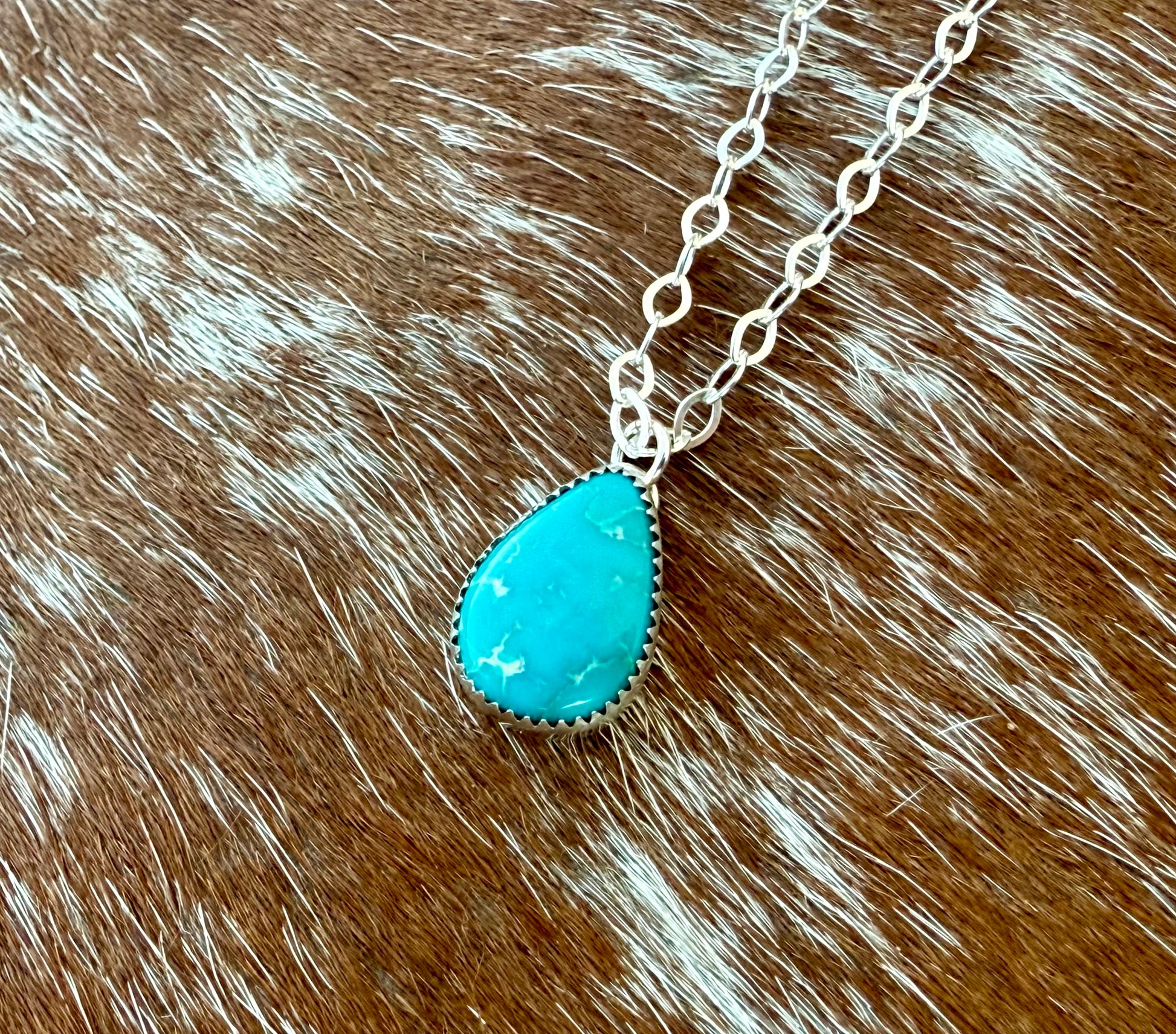 This is a bight Blue Ridge Turquoise necklace. The stone is a vivid blue with delicate white matrix. It is set in a sterling and fine silver. The teardrop pendant hangs from a 16” sterling silver chain with a one inch extension. The stone plus setting measures 7/16" x 5/8".